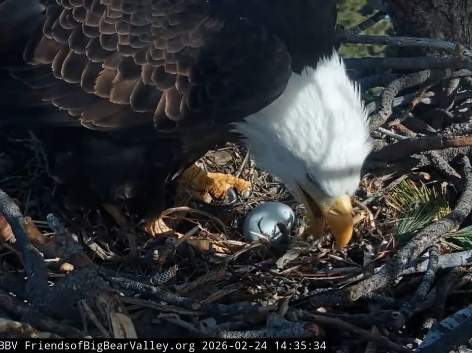 Internet-famous bald eagles Jackie and Shadow captivate fans on pip watch as their chicks prepare to hatch. Jackie laid the first egg of 2026 on January 23, followed by three more that all hatched successfully in early March. Fans tune in 24/7 to the Friends of Big Bear Valley livestream on YouTube, watching the parents' teamwork amid challenges like a fierce March 13 snowstorm that dumped two feet of snow on their nest. Read more about this...